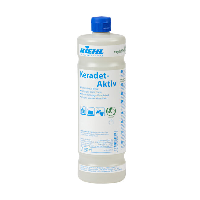 Kiehl Keradet-Aktiv Universal Reiniger ist ein hygienisch wirkender pH neutraler und reinigungsaktiver Alkoholreiniger, der einen frisch duftenden Geruch hinterlässt. Er trocknet schnell und streifenfrei ab und eignet sich daher besonders gut auf hochglänzenden Flächen. Keradet können Sie auf allen wasserfesten Oberflächen und Böden zum Einsatz bringen.