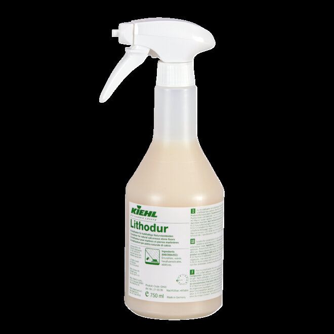 Lithodur ist eine Kristallisationsflüssigkeit für den Einsatz auf kalkhaltige Natursteinböden. Behandelte Steinbeläge erhalten eine hochglänzende Optik, werden abriebfest, rutschhemmend, schmutzabweisend und pflegeleichter. Die Dampfdiffusionsfähigkeit des Steines wird durch die Behandlung mit Lithodur nicht beeinträchtigt. Lithodur ist zur Kristallisation von kalkhaltigen Natursteinböden mit feingeschliffener bzw. polierter Oberfläche, wie z. B. Carrara-Marmor, Solnhofer-Platten, Jura und Travertin geeignet. Nicht wirksam auf Granit, Quarzit, Sandstein, Schiefer und Betonwerkstein
