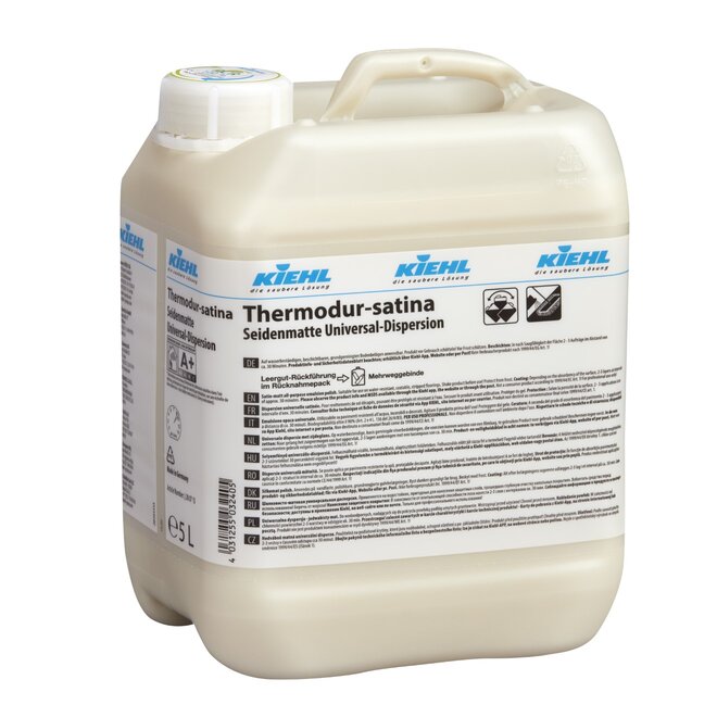 Kiehl Thermodur ist eine metallvernetzte matte Kunststoffdispersion mit hohem Feststoffanteil. Der Matte Film wird auch durch Polieren nicht glänzend. Die Beschichtung zeichnet sich durch eine besonders strapazierfähige, schmutzabweisende und wischfeste Eigenschaft aus. Ebenfalls ist Thermodur beständig gegen Flächendesinfektionsmittel. Bevor Sie den Boden beschichten sollte dieser unbedingt davor grundgereingt werden. Beachten Sie die jeweiligen Trockungszeiten nach der Grundreinigung, bevor sie Thermodur gleichmäßig auf dem Boden auftragen. Verwenden Sie dafür das Stangl Beschcithungsgerät.