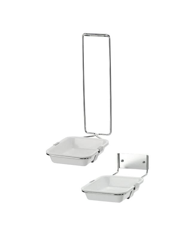 Verhindert das Abtropfen von Desinfektionsmittel von der Hand auf den Fußboden. Herausnehmbare spülmaschinengeeignete Kunststoffschale.