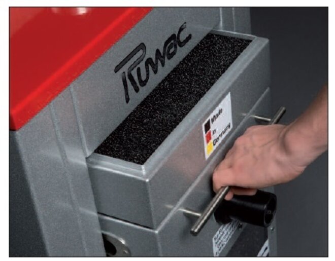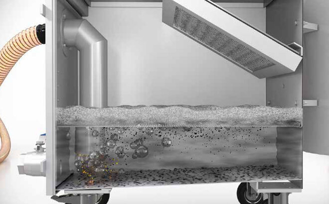 Bei diesem Industriesauger wird das Saugmedium durch einen Sauganschluss in den Nassabscheider eingesaugt. Im Flüssigkeitsbehälter verwirbeln Luft, Staubpartikel und Flüssigkeit. Die Staubpartikel werden mit der Flüssigkeit benetzt und sammeln sich als Sediment am Boden des Behälters. Flüssigkeit, die von der Transportluft mitgeführt wird, agglomeriert an dem im Saugluftstrom liegenden Feuchtigkeitsabscheider und tropft in den Flüssigkeitsbehälter ab. Restliche Staubpartikel werden anschließend an den drei Filterpatronen der Staubklasse H abgeschieden.