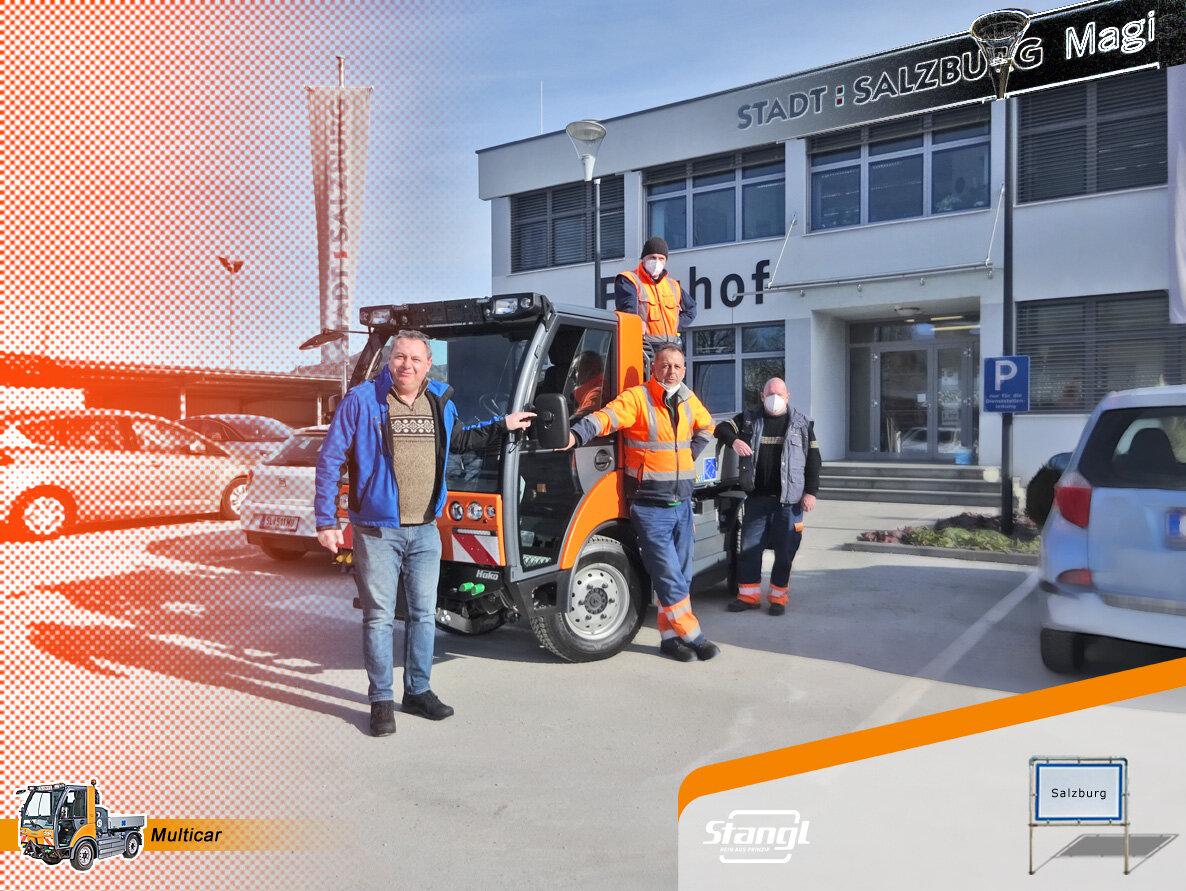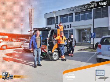 Fuhrparkleiter Christian Fuschlberger und die Mannschaft vom Wirtschaftshof des Magistrats Salzburg, übernehmen ihre neue Kommunalmaschine, einen Multicar M29, vom Team Stangl-Kommunal. Der neue Multicar wird in Salzburg für Transporte, zum Straßen waschen und für den Winterdienst eingesetzt. (2021)