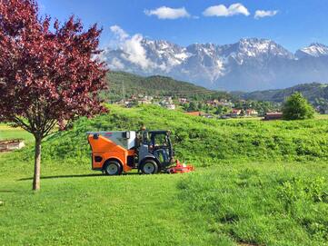 Die Maschine ist konstruiert als universeller Geräteträger und bietet im kommunalen Einsatz unzähliche Möglichkeiten, für effiziente Straßenerhaltung, Schneeräumung, Pflege von Grünflächen, Bewässern, Unkraut bekämpfen und vieles mehr.