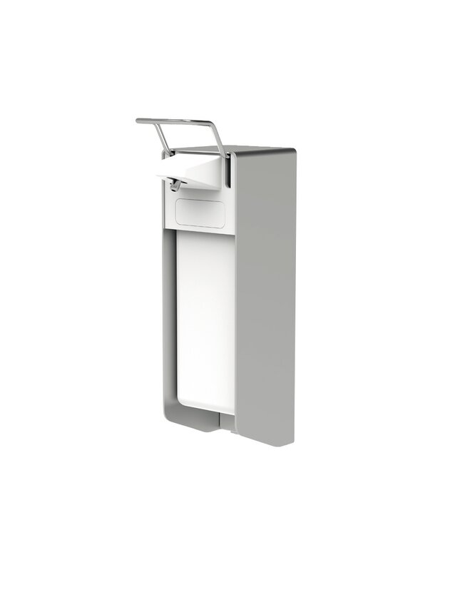 Aluminiumspender zur Wandmontage für 1 Liter Gebinde. Mit Edelstahlpumpe und Edelstahlarmhebel. Geeignet für reibemittelhaltige Handreiniger.
