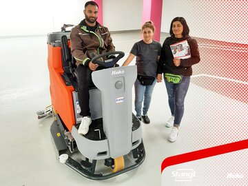 Das Team von ,onefacility' freut sich über eine neue Bodenreinigungsmaschine von Stangl, Typ Hako Scrubmaster B175-R, für das M4-Einkaufszentrum In Wörgl.
