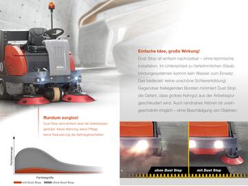 Herkömmliche Staubminderungssysteme sind oft mit größerem technischen Aufwand oder Einschränkungen beim Kehren verbunden. Staubbindung mit Wasser zB.bedeutet oft: Schlieren beim Kehren, starke Verschmutzung der Maschine, durchWasser nachfüllen und Wartung des Wassersystems (Düsen, Schläuche). Feste Kehrbesen-Hauben mit Absaugung schränken das randnahe Arbeiten beim Kehren ein, der Tellerbesen ist nicht zu sehen.